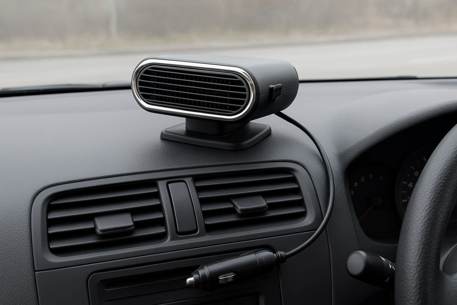 جهاز تدفئة وإزالة ضباب للسيارة يعمل بالكهرباء عبر مدخل 12 فولت. يتميز بحجمه الصغير وتصميمه العصري، ويوضع على التابلوه لتوجيه هواء دافئ نحو الزجاج الأمامي، مما يساعد على منع التكثف وتحسين الرؤية خلال الشتاء.